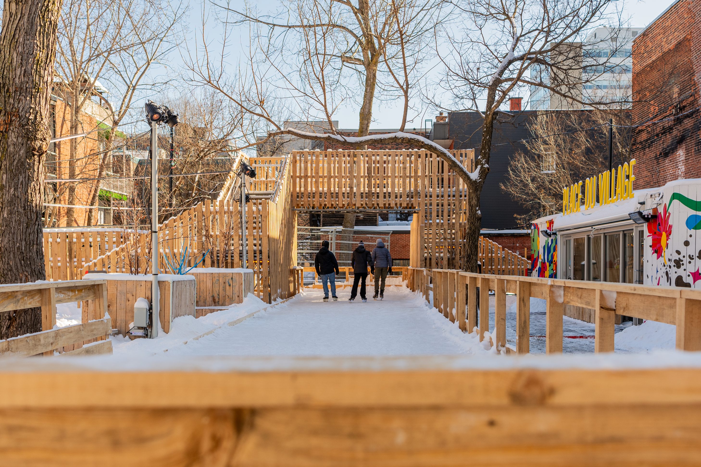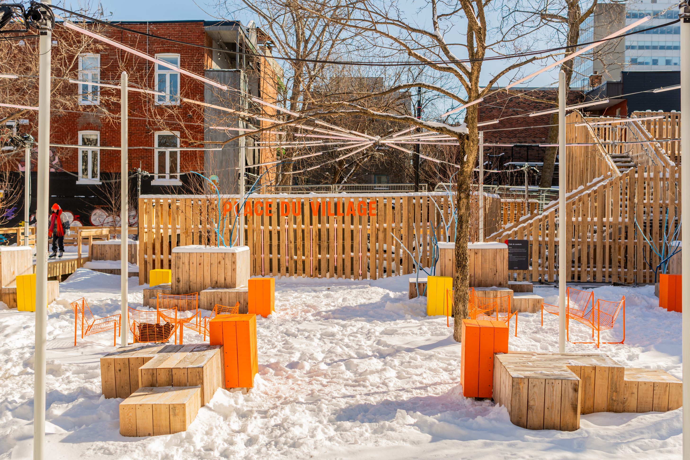 La Place du Village dans sa version hivernale met au coeur de son déploiement un anneau de patinoire mise en valeur par un éclairage signature et un aménagement en cohérence avec les installations existantes.